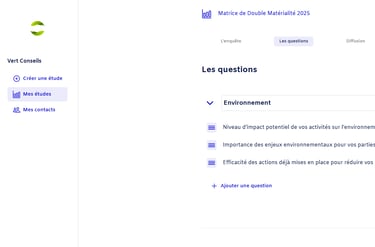 Plateforme pour consultant RSE à destination des entreprises clientes. Réalisation de diagnostic RSE et de matrice de double matérialité. Desktop first.