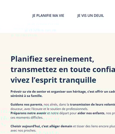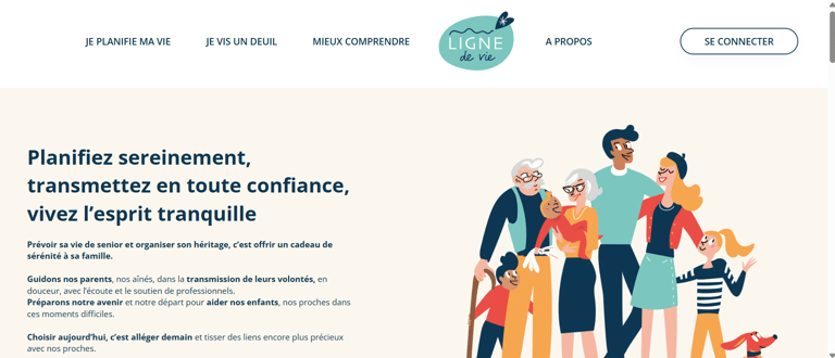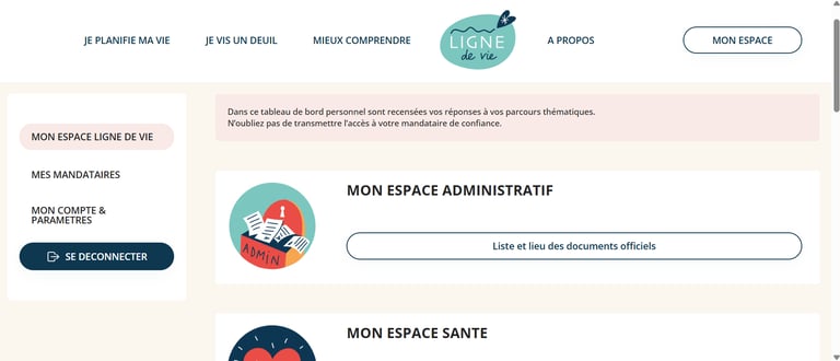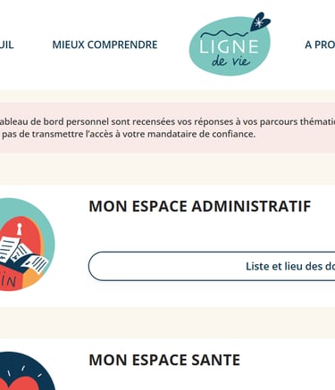 Plateforme composée de formulaires centralisant le vécu, le patrimoine et les directives de l'utilisateur. Accès à un tableau de bord. Responsive design.